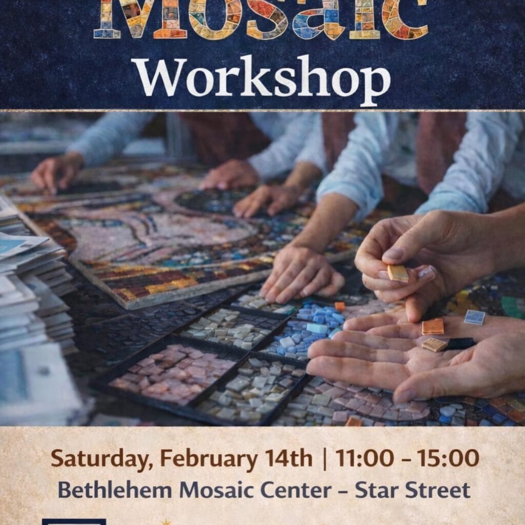 Join us for a hands-on mosaic workshop at the Bethlehem Mosaic Center, where participants will be introduced to the art of traditional mosaic making. During the workshop, you will learn the basics of mosaic composition, work with stone tiles, and create your own piece.